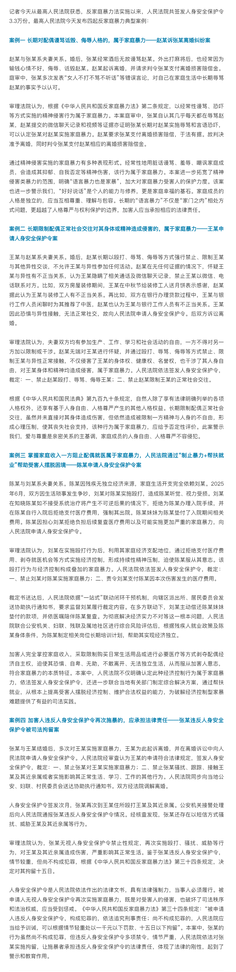 最高法:长期对配偶谩骂诋毁、侮辱人格的,长期限制配偶正常社会交往对其造成侵害的,掌握家庭收入一方阻止配偶就医的,均属家庭暴力